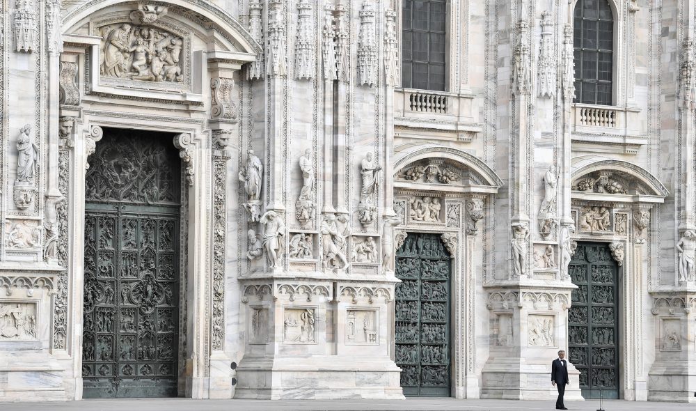 NewsItaliaAndrea Bocelli sang for håp13-04-2020Den italienske tenoren Andrea Bocelli holdt påskekonsert i og foran en tom domkirke i Milan påskesøndag. Målet var å spre håp i verden.
