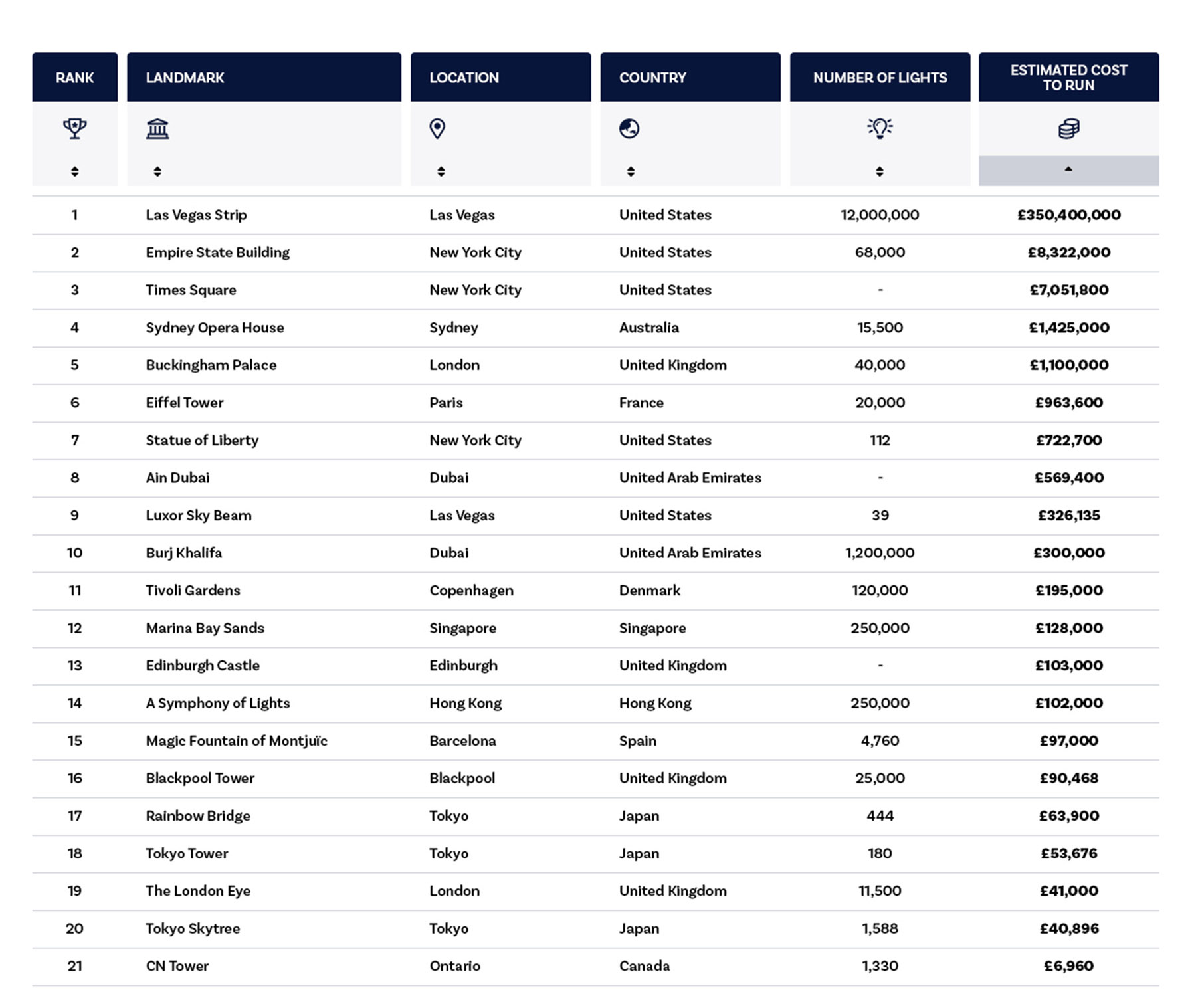Lysene i operahuset i Sydney blir således «puslete» til sammenligning. De koster rundt 8,7 millioner kroner å holde liv i hvert år, Londons Buckingham Palace koster 17,2 millioner kroner og Eiffeltårnet i Paris 8,7 millioner kroner.